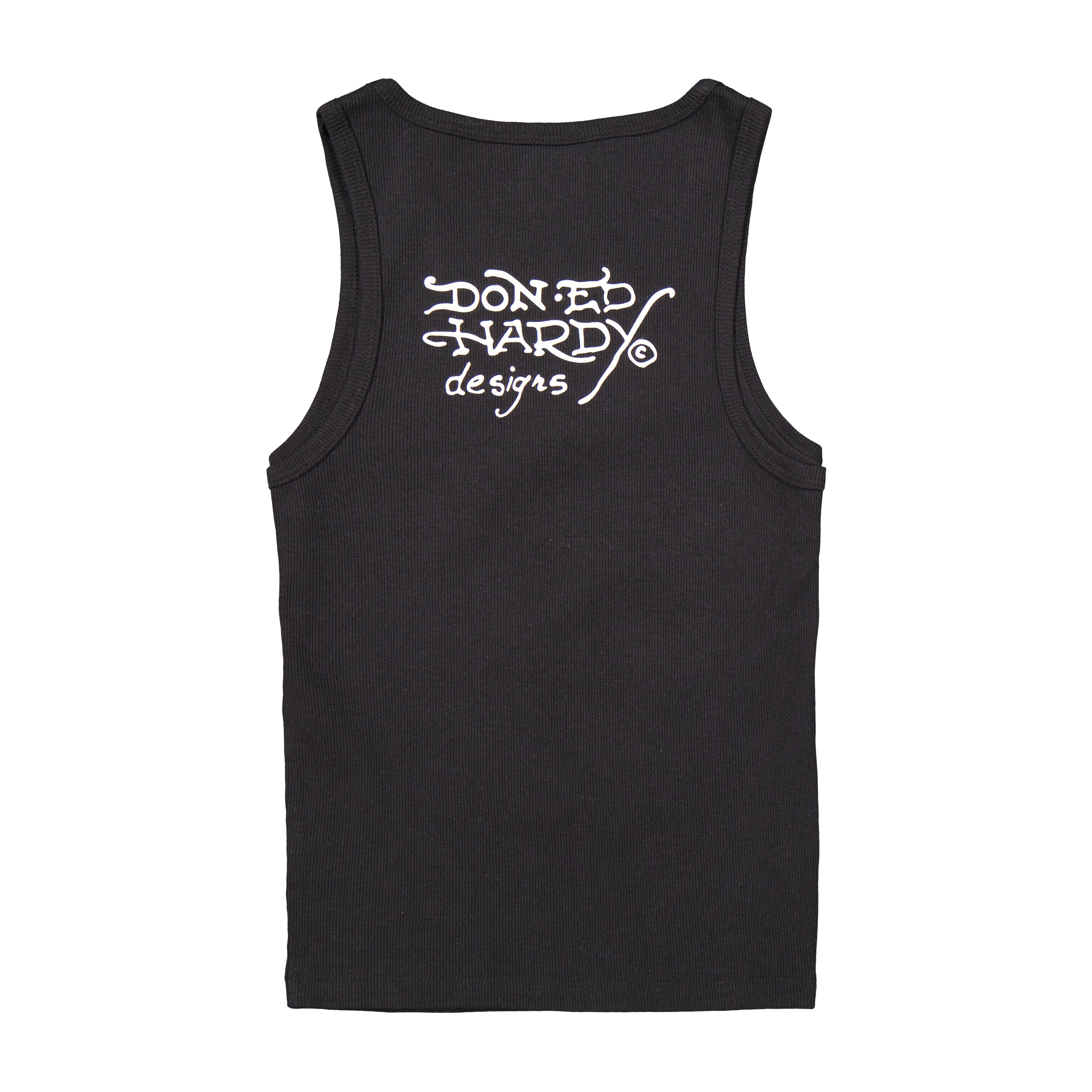 Slim fit tank top cut from a rib knit in black and adorned with rhinestones. Features a signature Ed Hardy fun dagger graphic and multiple archival logos.