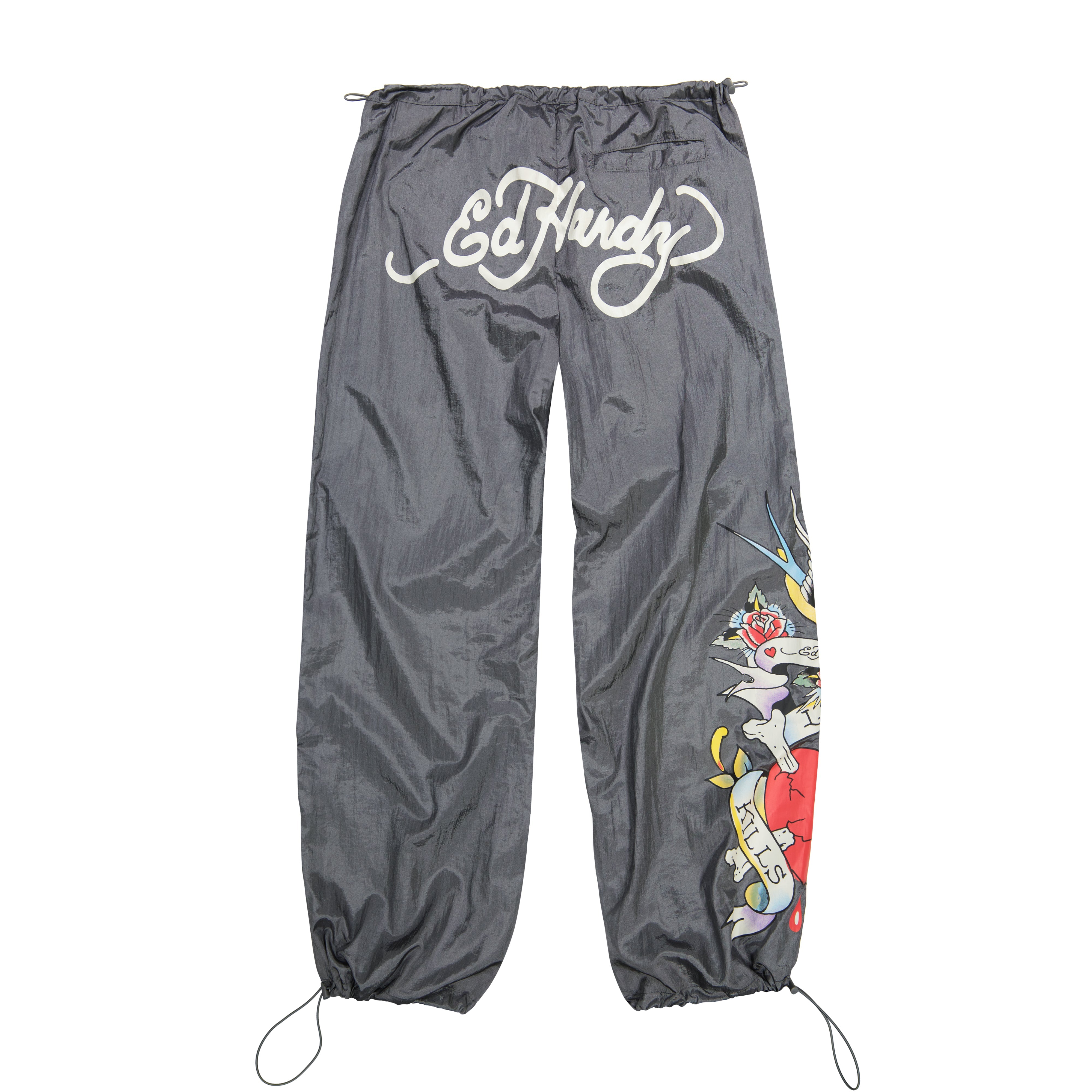 Nylon parachute silhouette with adjustable drawstring on hems. Features an archival Ed Hardy LKS skull graphic and several signature logos.