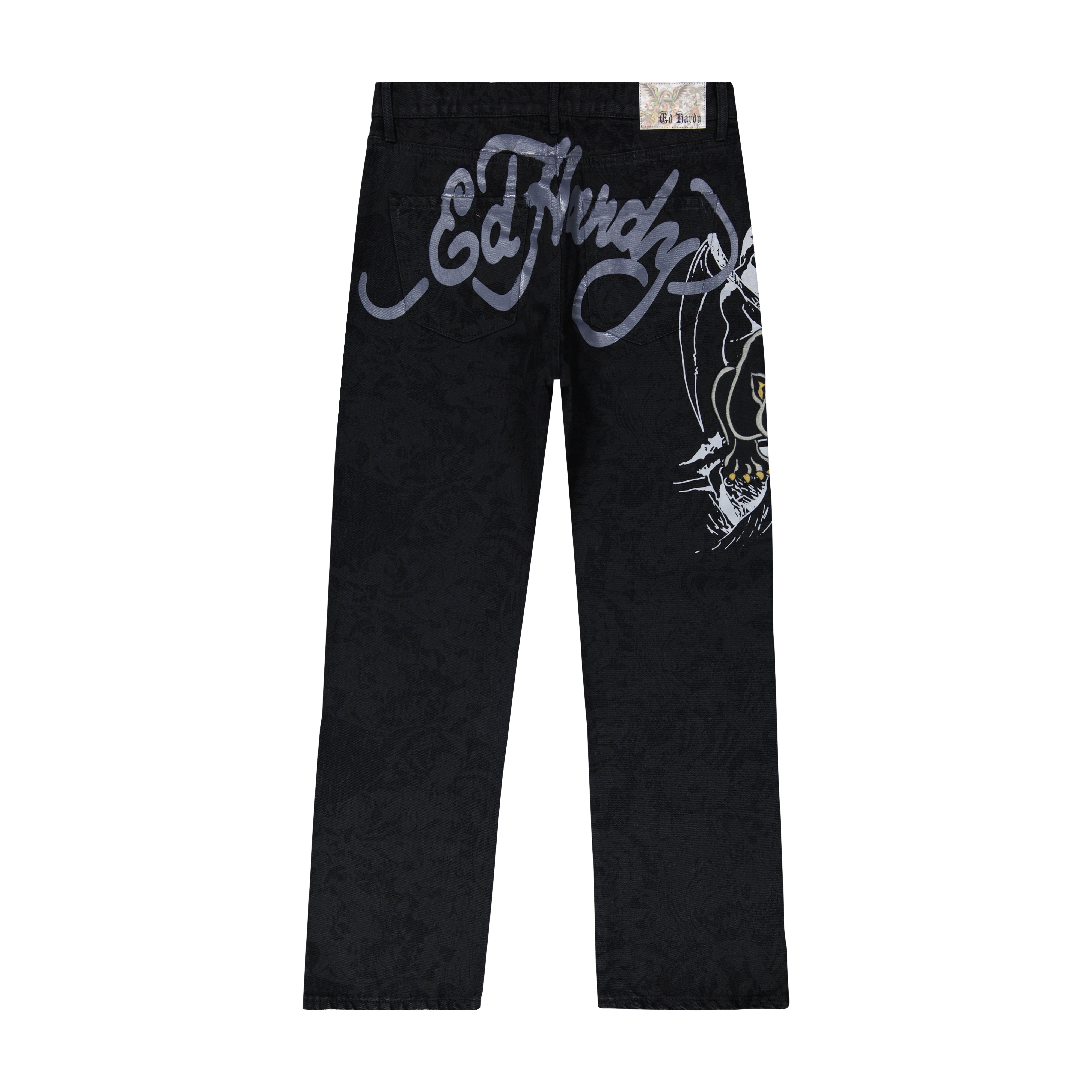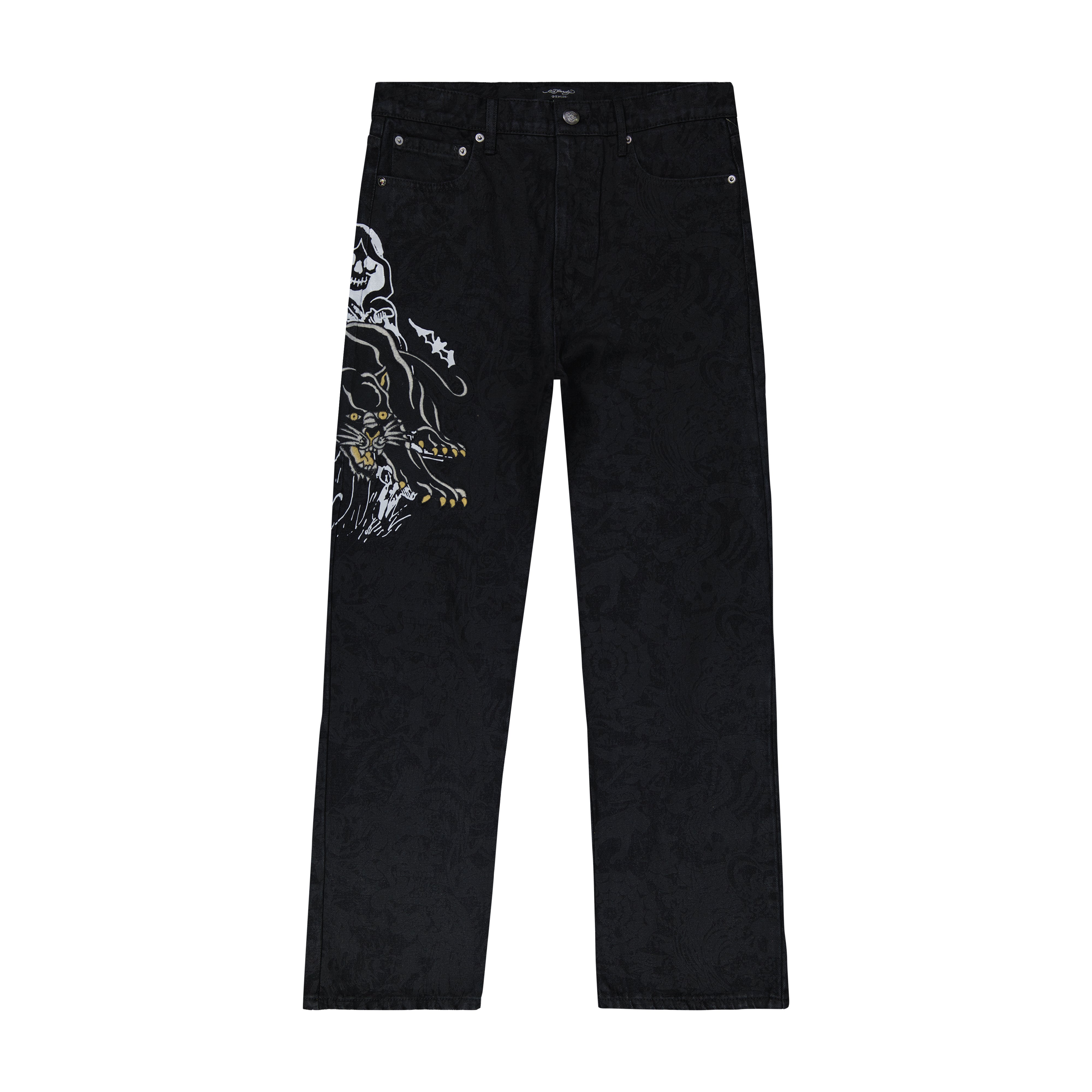 Baggy jeans cut from a black denim. Features archival Panther Reaper artwork and complete with a signature Ed Hardy logo on the back.