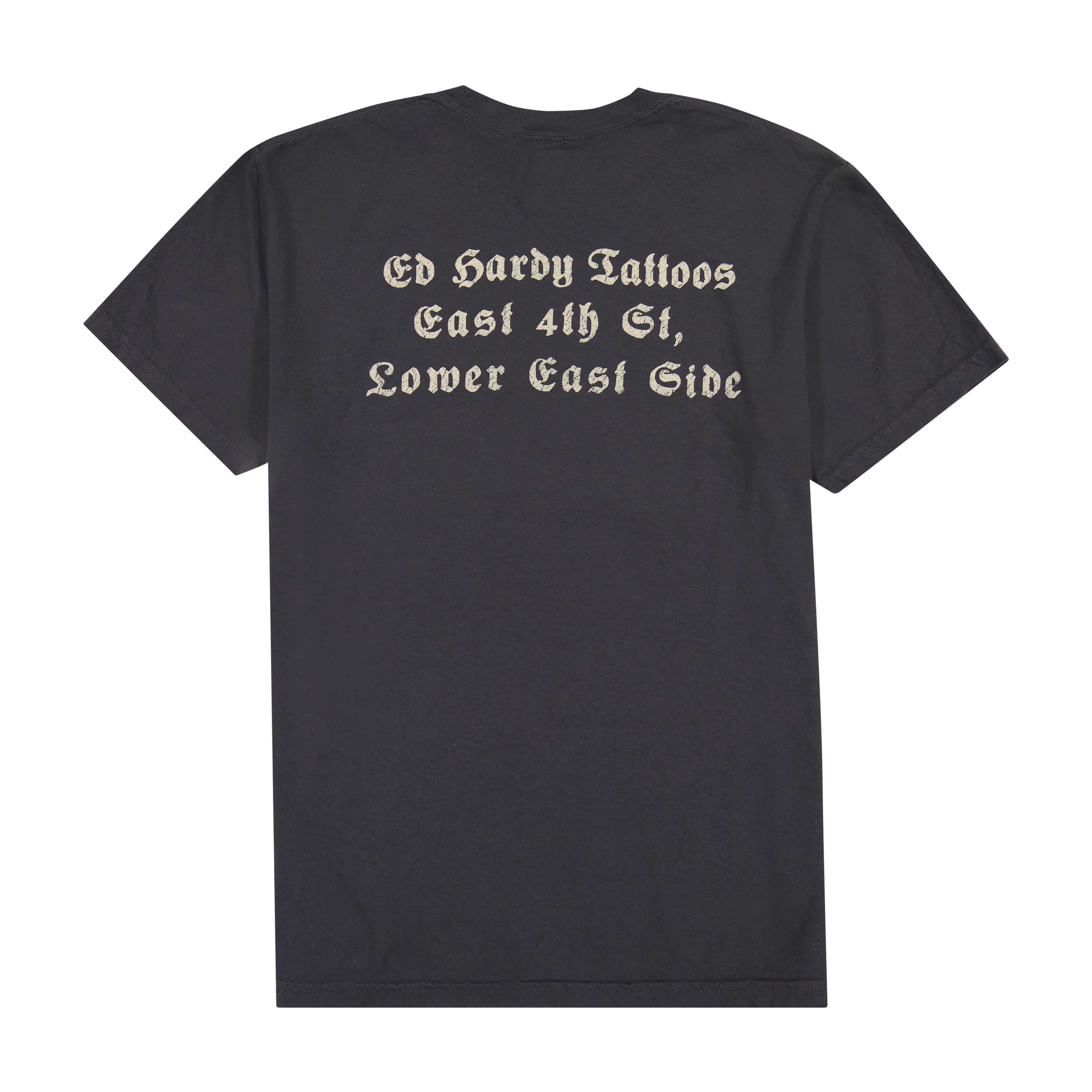 100% cotton tee treated with a garment wash to evoke a vintage feel. Complete with archival Ed Hardy logos and profile tiger graphic.