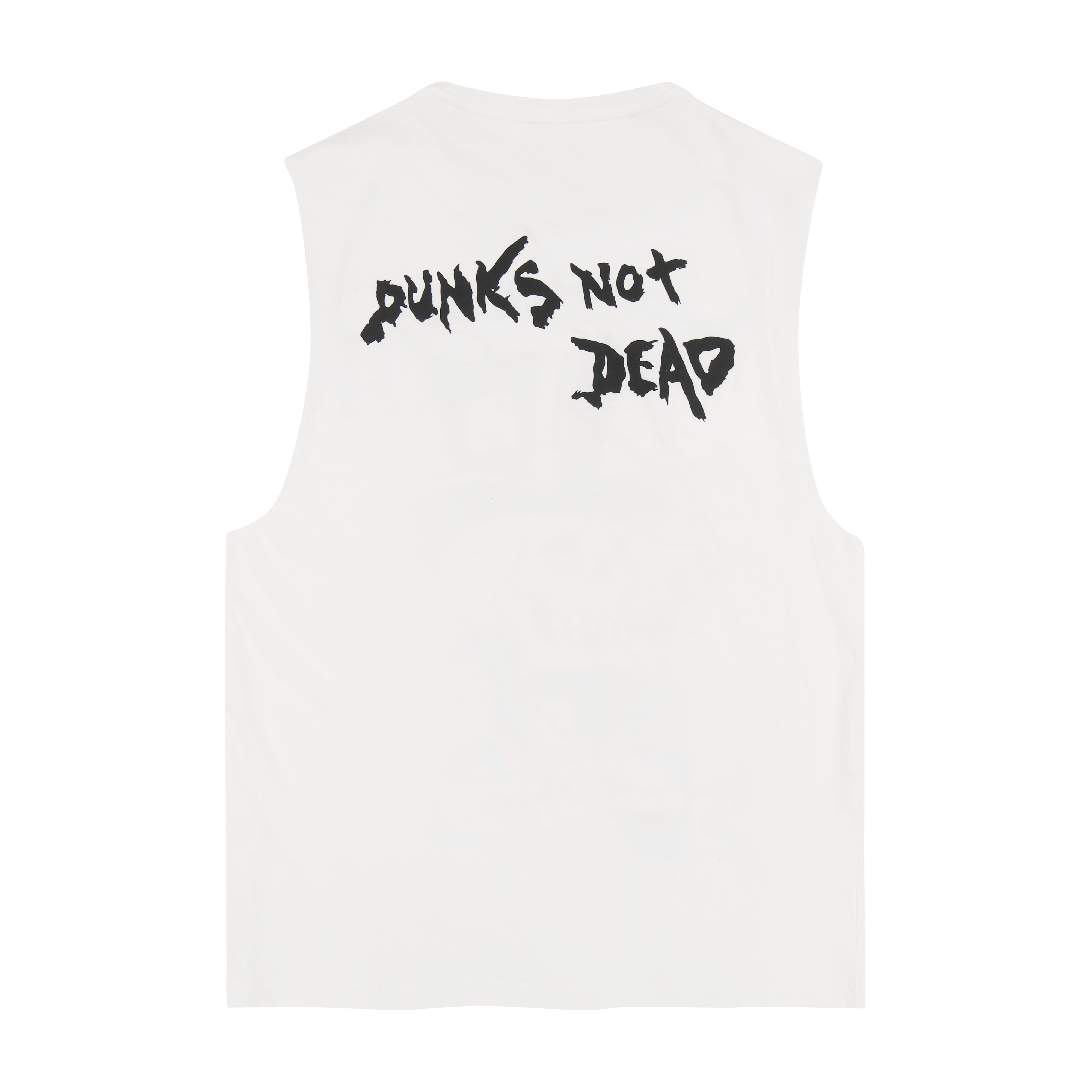 This cotton blend cut off tee features archival skull tophat and "punks not dead" graphics, as well as a black logo.
