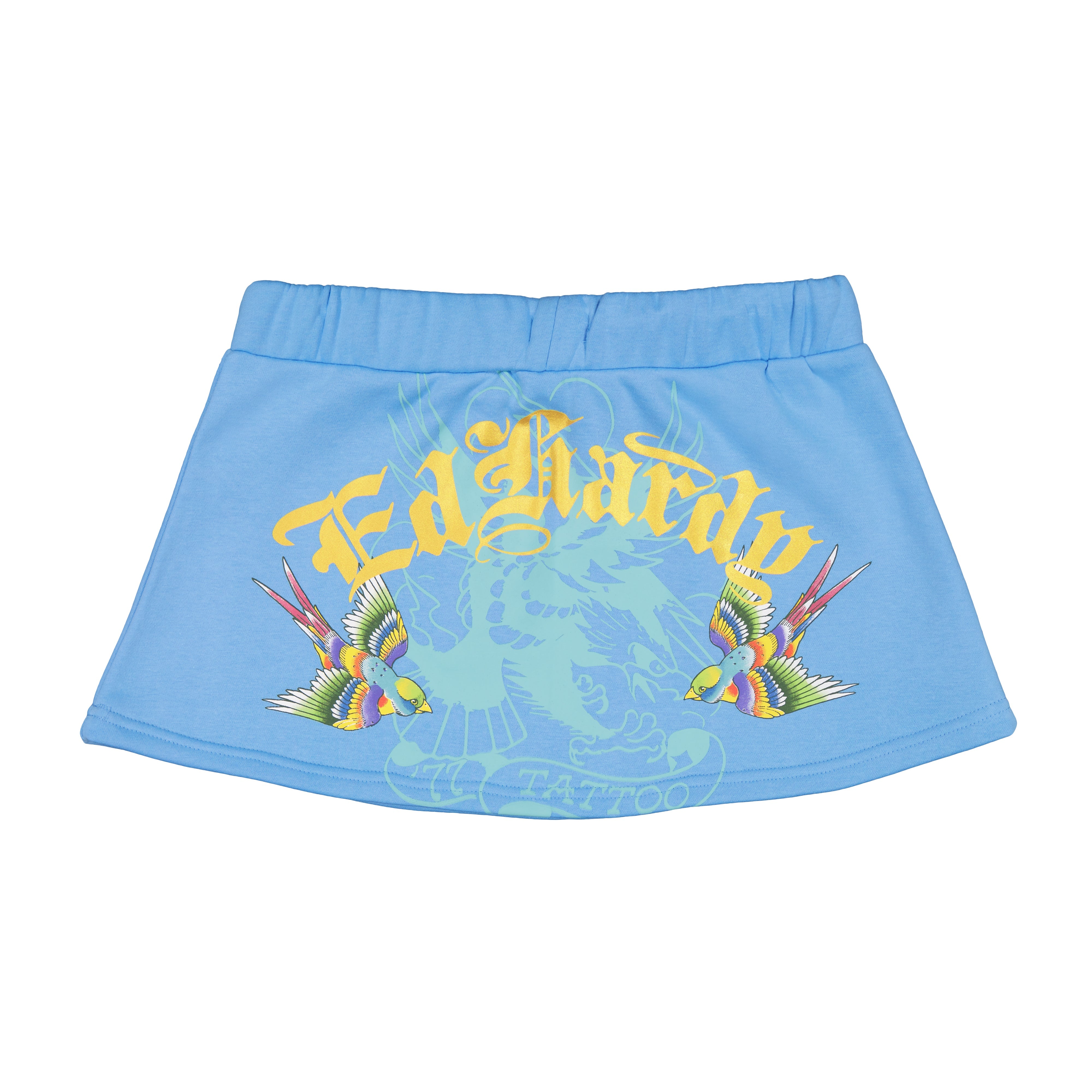 Adorable fleece mini skirt in a powder blue. Features an adjustable drawstring and layers of iconic Ed Hardy artwork and logos. Pair with our Swallows Short Sleeve Hoodie to complete your look.