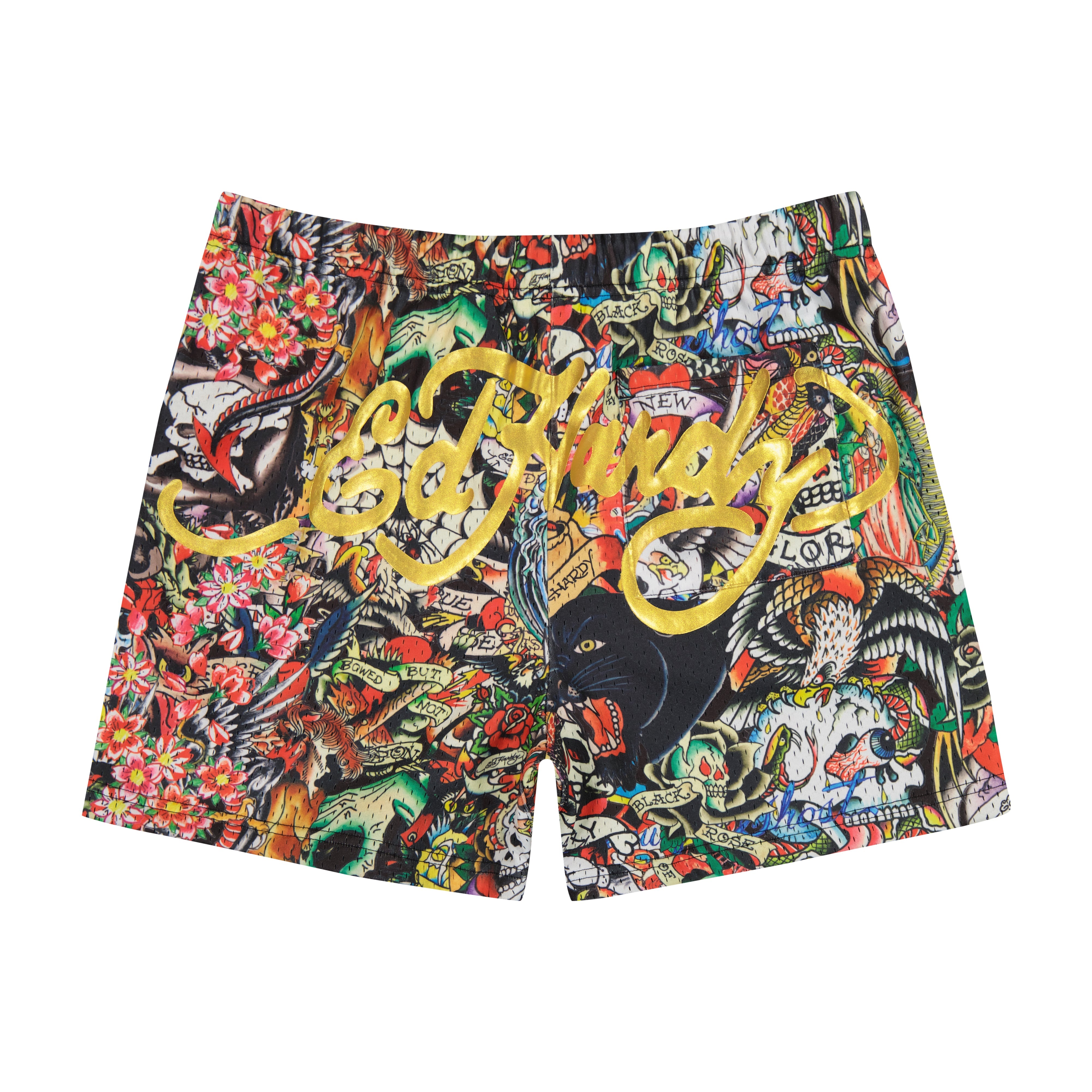 Classic basketball short silhouette cut from a double ply mesh. Features three pockets and an adjustable drawstring. Includes iconic tattoo collage graphics complete with a signature gold logo.