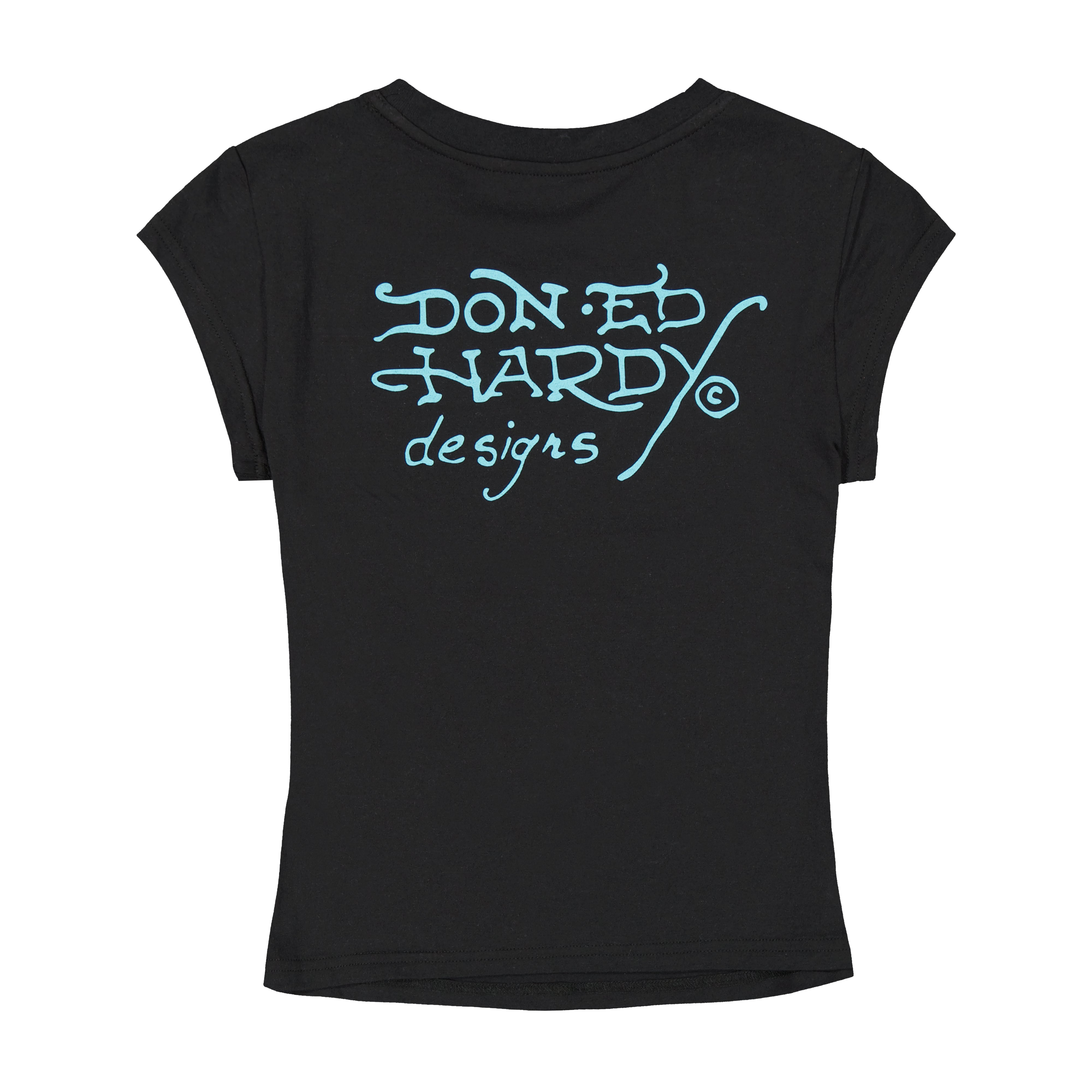 Cap sleeve fitted tee cropped at the waist and cut from a cotton poly blend in black. Complete with archival logos and layered Ed Hardy graphics.